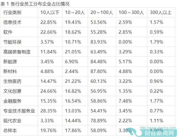 分行业来看,金融服务行业员工人数在100人以上的创业企业数中占比最高,达9.25%,其中,100人至300人的企业达7.48%,300人以上的企业达1.77%,均高于总样本水平。信息技术行业、文化创意行业、专业技术行业和软件行业20人以下的创业企业数比重均明显高于总样本水平,分别占各行业企业数量的42.28%、41.48%、41.38%和41.28%。而新材料、新能源和节能环保行业的创业企业人数更为明显地集中在20人至100人的区间内,占比分别为87.80%、84.48%和83.93%。