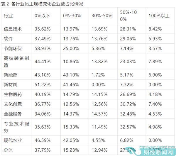 从行业分布来看,信息技术行业、文化创意行业和金融服务行业中有超过五成企业员工增长率超过50%,占比分别为50.42%、50.68%和51.58%。信息技术行业、高端装备制造行业、文化创意行业员工增长率100%以上的创业企业数占比高于总样本水平,分别为8.42%、7.89%和7.40%。