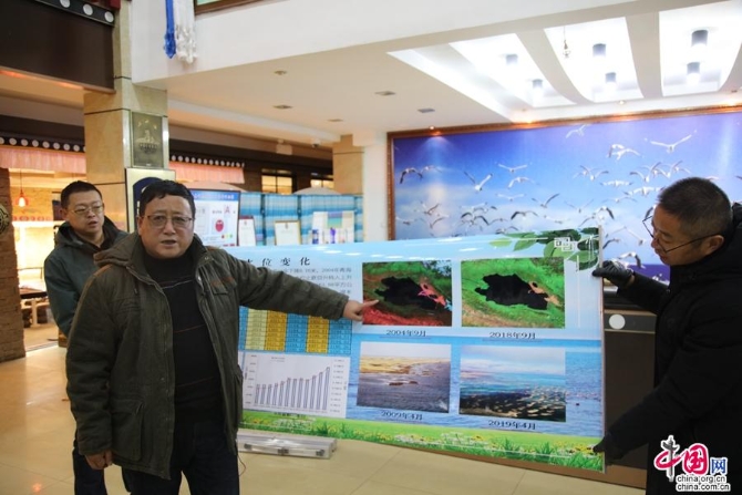 青海湖自然保护区管理局局长何玉邦向记者介绍青海湖2004年—2019年水位变化