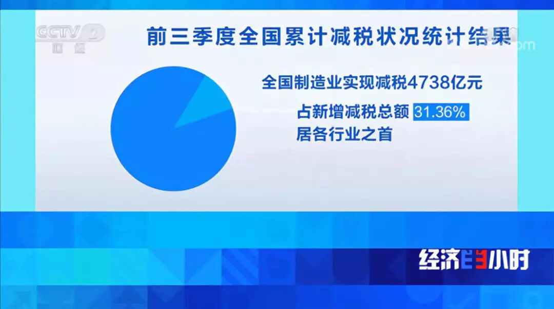 享受到这样政策红利的不止河钢集团一家,统计数据显示:今年前三季度,全国累计新增减税降费17834亿元,其中新增减税15109亿元,新增社保费降费2725亿元。全国制造业实现减税4738亿元,占新增减税总额的31.36%,居各行业之首。