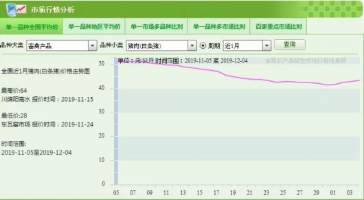 农业农村部对200个批发市场监测调度数据显示,12月1日猪肉价格为每公斤41.48元,比11月1日价格高峰的每公斤52.40元下降10.92元,降幅达20.84%。