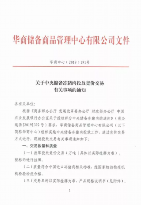 《中央储备冻猪肉投放竞价交易有关事项的通知》来源:华储网