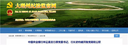 中国农业银行祥云县支行原党委书记、行长史钧被开除党籍和公职