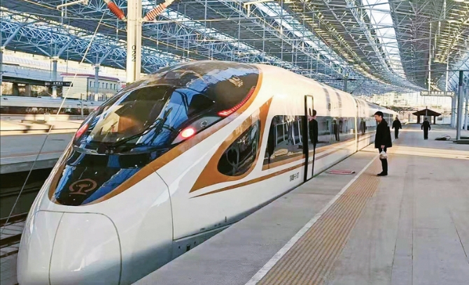 京张高铁是京津冀协同发展的重要基础工程,是2022年北京冬奥会的重要交通保障设施。100多年前,我国开通了首条由中国人自主设计、营运的铁路干线——京张铁路。将于2019年底正式开通的京张高铁,是我国第一条采用北斗卫星导航系统、设计时速350公里的智能化高速铁路。届时,北京到张家口的铁路旅行时间将由3.5小时缩短到1小时以内。图为2019年12月3日,试验列车停靠在北京北站。 新华社发 李桦/摄