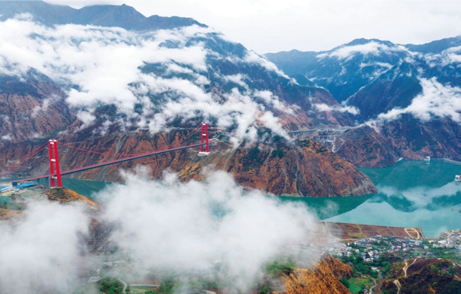 四川雅康高速公路东起雅安、西至康定,全长135公里,是成都平原连接甘孜藏区进而通往西藏的重要通道,被誉为“云端天路”。雅康高速于2018年12月31日全线建成并试通车运营,从而结束了甘孜藏族自治州康定市不通高速的历史,有力助推藏区脱贫攻坚。图为雅康高速泸定大渡河大桥(2019年10月15日摄)。 新华社记者 江宏景/摄