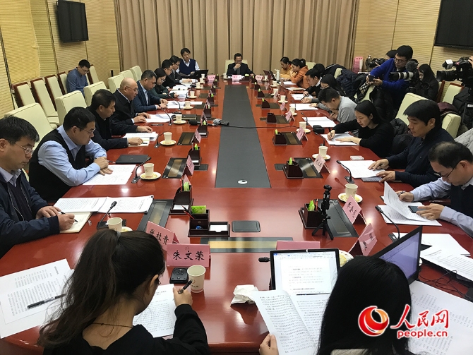 农业农村部种植业管理司司长潘文博(左二)介绍化肥和农药利用率情况(人民网 张桂贵/摄)
