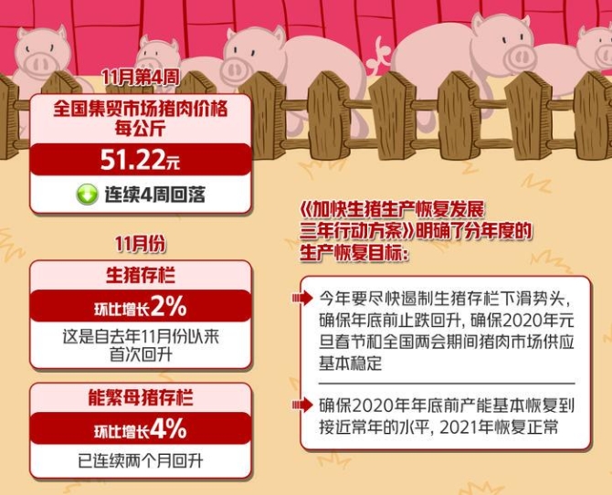 截至目前,31个省份都出台了文件,形成了恢复生猪生产的强大推动力。王俊勋说,恢复生猪生产政策效果开始显现,加上市场行情带动,生猪养殖场户补栏信心进一步增强,全国生猪生产开始探底回升。据监测,11月第4周,全国集贸市场活猪价格每公斤32.26元,猪肉价格每公斤51.22元,连续4周回落,比价格高峰分别回落16.7%和12.6%。