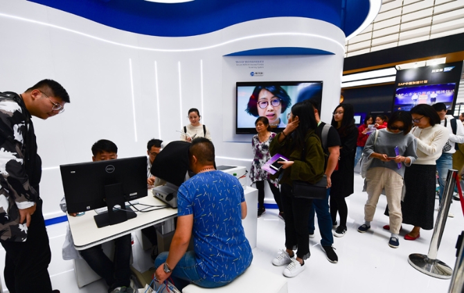 在浙江乌镇举行的互联网之光博览会上,观众在腾讯的人工智能展台前排队体验眼底检查(10月21日摄)。新华社记者 尹栋逊/摄