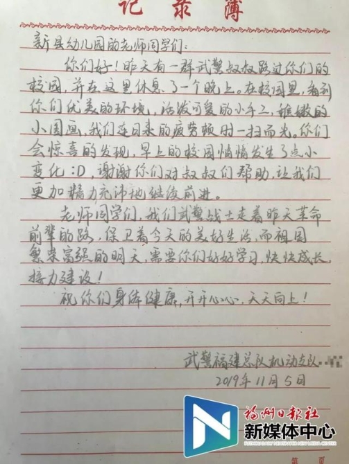 在训练第三天,官兵们借宿莆田新县镇一处幼儿园后,在每个小朋友的座位上都放了一颗糖果,并悄悄给师生们留下了一封感谢信。