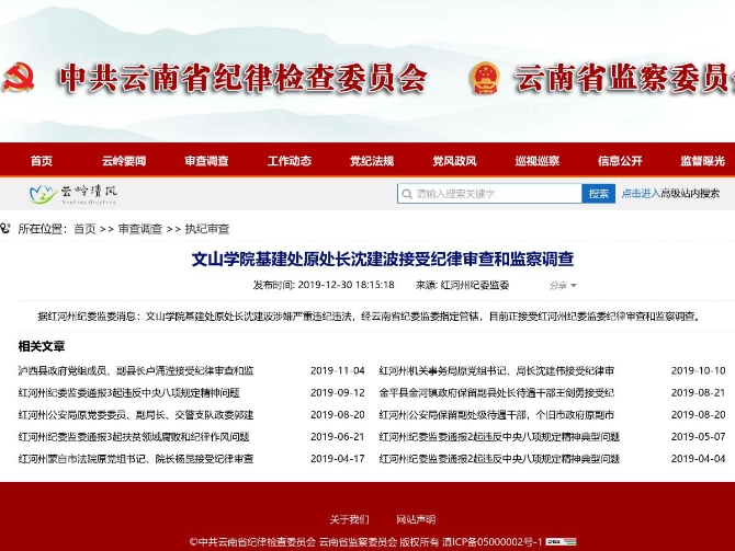 昆明信息港讯 12月30日,据红河州纪委监委消息,文山学院基建处原处长沈建波涉嫌严重违纪违法,经云南省纪委监委指定管辖,目前正接受红河州纪委监委纪律审查和监察调查。