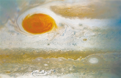 在这幅油画中,大红斑独特而耀眼。它呈卵形,东西长约2.6×104千米,南北宽约1.2×104千米,大概位于木星赤道以南、南纬22°的位置。资料显示,大红斑最初的覆盖范围大到足以吞进2—3个地球。