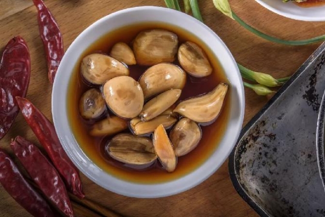 将紫皮蒜浸入米醋