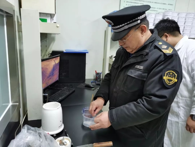 测温合格后,市场监管人员联合市场主办方开始核验供货商提供的《动物检验合格证明》《肉品品质检验证明》《非疫区证明》,目测胴体猪肉上的“检疫验讫印章”和“肉品品质检验验讫印章”,随机切割猪肉样本进行快速复检。在新发地肉类交易大厅检测室,记者看到工作人员正在对猪肉肉质的含水量进行检测,同时检测猪肉是否含有瘦肉精。