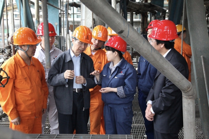 ▲陈俊武院士在陕西华县DMTO工业试验项目现场听取装置试车情况汇报