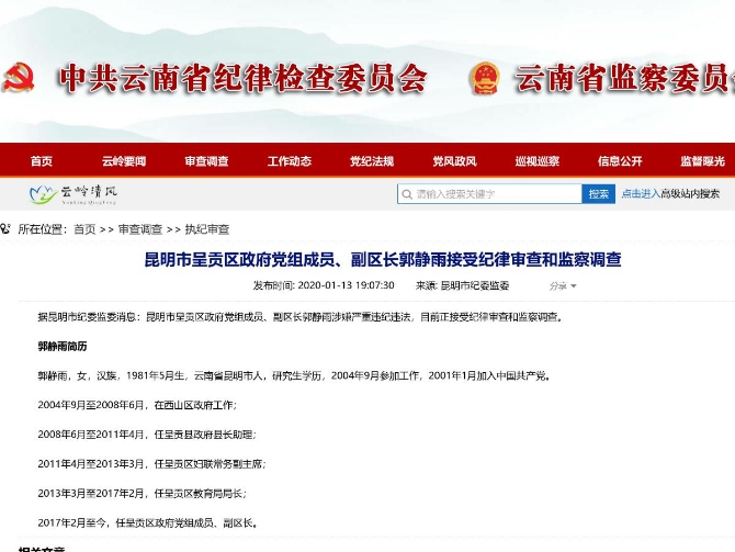 昆明信息港讯 机器人小明 据昆明市纪委监委消息:昆明市呈贡区政府党组成员、副区长郭静雨涉嫌严重违纪违法,目前正接受纪律审查和监察调查。