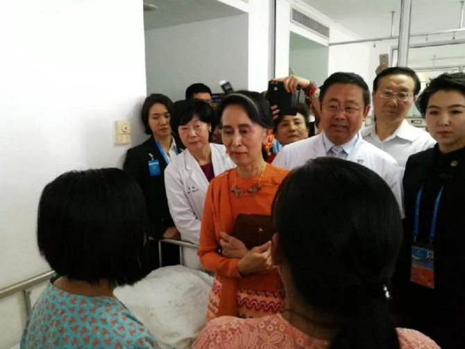 2017年5月16日,缅甸国务资政昂山素季来到北京安贞医院看望受救助在京做手术的缅甸先心病患儿。她在北京出席首届“一带一路”国际合作高峰论坛。新华社记者李雪笛摄