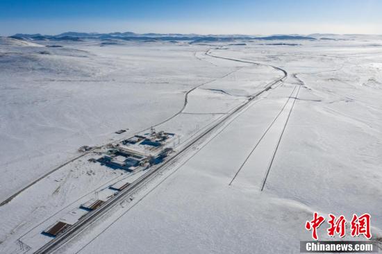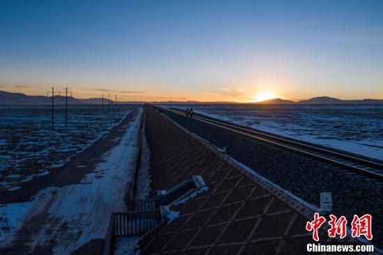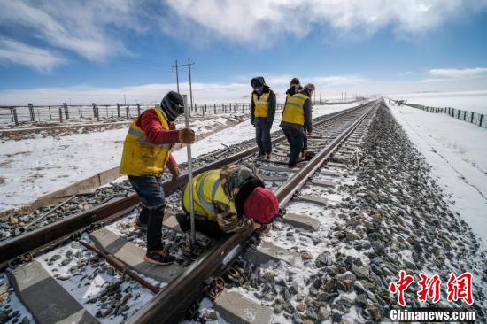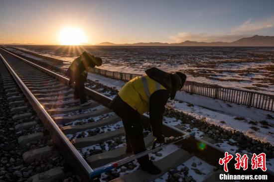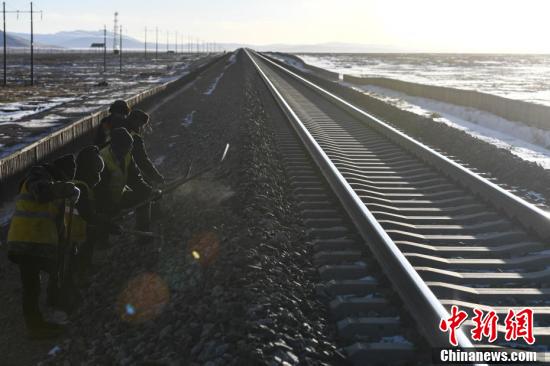 航拍安多车间工作人员检查轨道设备情况。在这里坚守的数十名工作人员负责辖区36公里的青藏铁路线路维护任务,他们守护在“生命禁区”的“天路”两旁,保障每一列穿行于“世界屋脊”的列车安全运行。(中新社记者 何蓬磊 摄)
