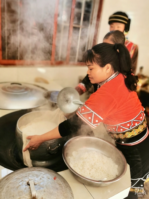 △李发顺一家正在制作节日传统食品大米粑粑。(总台央视记者史伟、央广记者马喆拍摄)