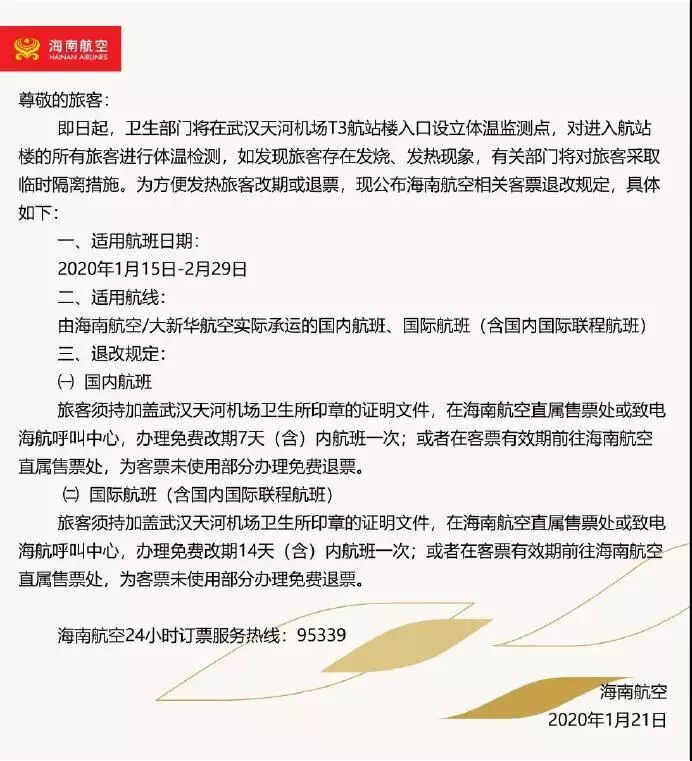 为更好协助乘坐涉及武汉进出港航班的旅客,海南航空特对已购买涉及武汉航班机票的旅客提供免费退票服务,现下发相关票务规定,具体如下: