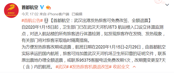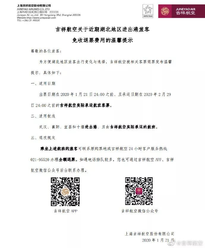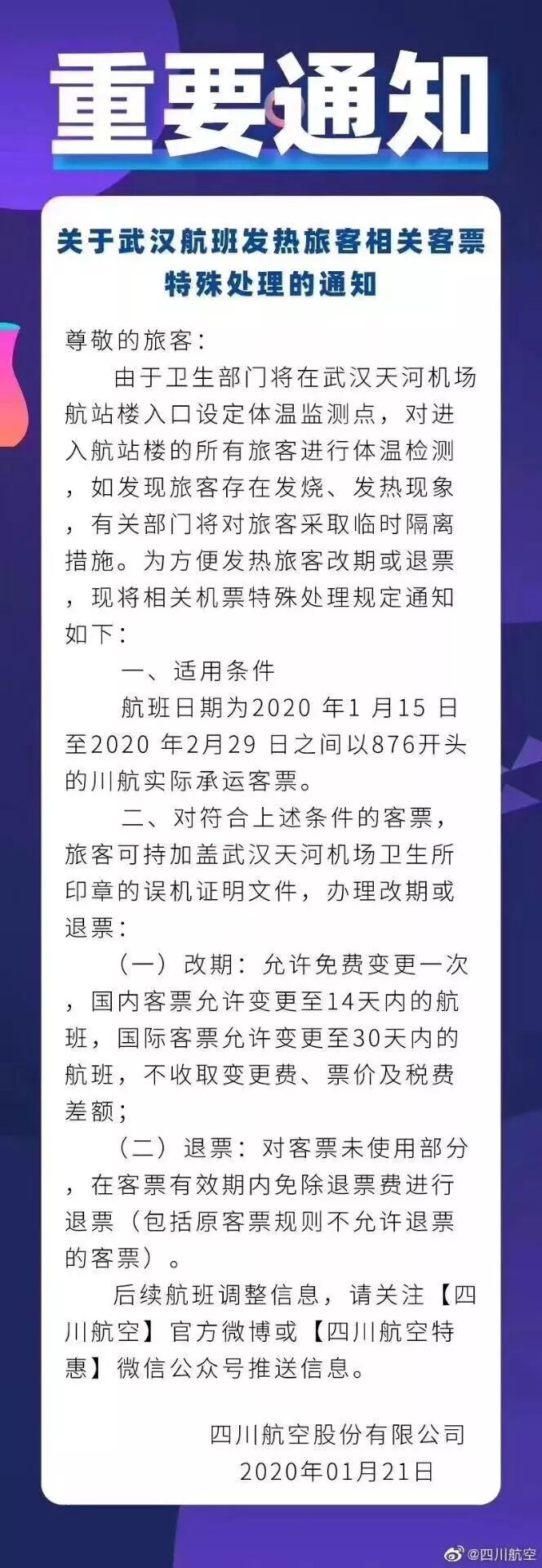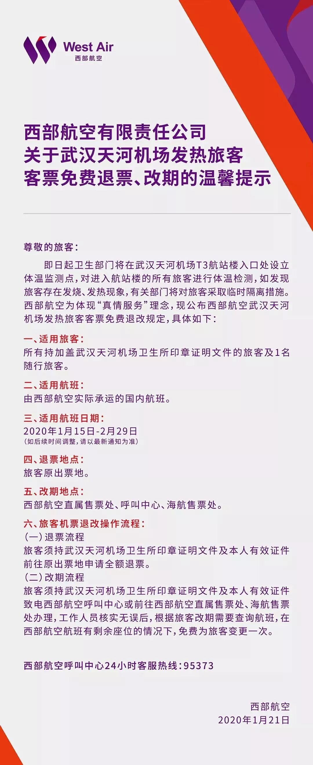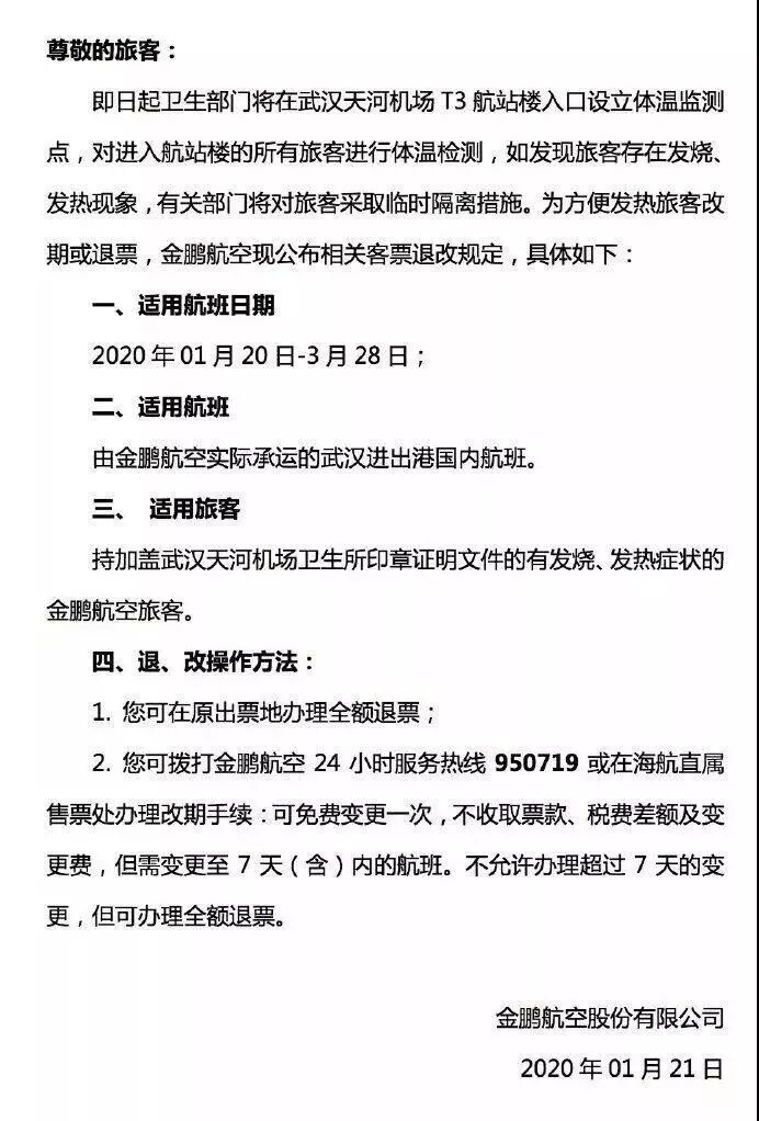 截至21日发稿时,其他航空公司包括吉祥航空、首都航空、天津航空、昆明航空、西部航空、祥鹏航空、金鹏航空、四川航空、多彩贵州航空等多家国内航空公司已经发出通告,针对武汉出港的发热旅客,提供免费退改签服务。