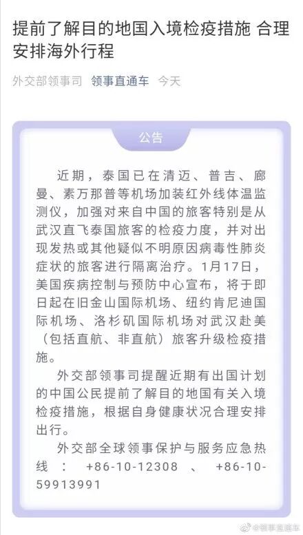 泰国、美国已开始对来自中国特别是武汉的旅客加强入境检疫。外交部领事司提醒近期有出国计划的中国公民提前了解目的地国入境检疫措施,根据自身状况合理安排行程。