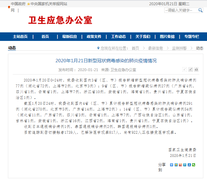 截至1月20日24时,我委收到国内4省(区、市)累计报告新型冠状病毒感染的肺炎确诊病例291例(湖北省270例,北京市5例,广东省14例,上海市2例);14省(区、市)累计报告疑似病例54例(湖北省11例,广东省7例,四川省3例,云南省1例,上海市7例,广西壮族自治区1例,山东省1例,吉林省1例,安徽省1例,浙江省16例,江西省2例,海南省1例,贵州省1例,宁夏回族自治区1例)。