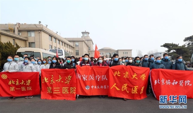 1月26日,国家援鄂抗疫医疗队队员在北京首都机场合影。新华社记者 张玉薇 摄