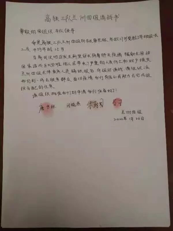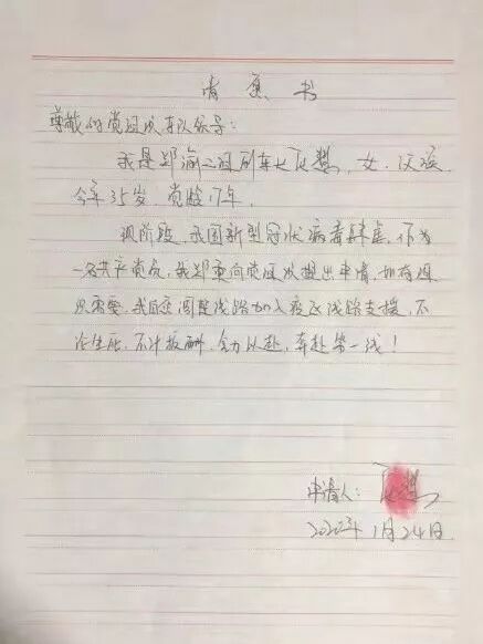 张慧在请愿书中写到,“作为一名共产党员,我郑重向党组织提出申请,如有组织需要,我自愿调整线路加入疫情区线路支援,不论生死,不计报酬,全力奔赴第一线。”