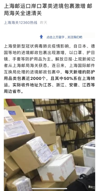(上海邮运口岸口罩类进境包裹激增 邮局海关全速清关)
