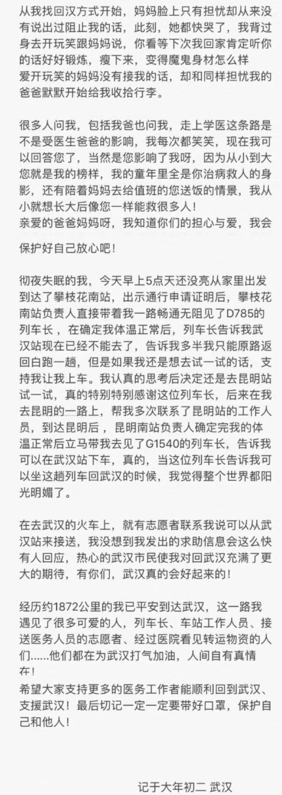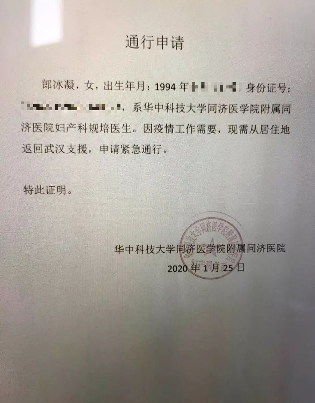 原来,郎冰凝是华中科技大学同济医学院附属同济医院妇产科的规培医生,年前从武汉回老家探亲,得知武汉疫情形势严峻后,她主动请缨,在“紧急支援通行申请”通过后,毅然决定奔赴武汉。