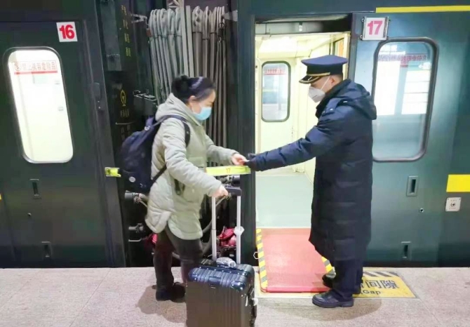 中国铁路济南局集团有限公司青岛客运段团员青年在值乘中,做好车辆消毒、体温监测及重点旅客帮扶工作。