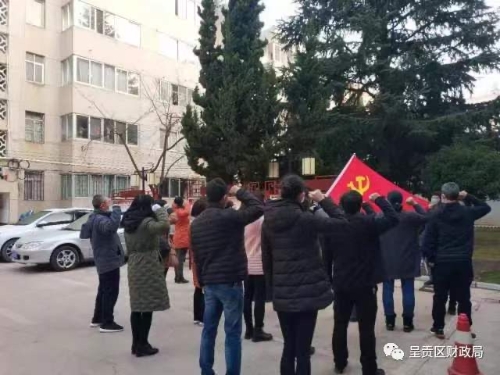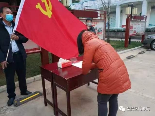 李艳梅副书记宣布了呈贡区财政局抗击新型冠状病毒引起的肺炎疫情党员先锋队组建通知,刘燚局长带领先锋队党员在党旗下庄严宣誓,储华同志代表全体党员宣读了《请战书》,全体队员在请战书上郑重签字。