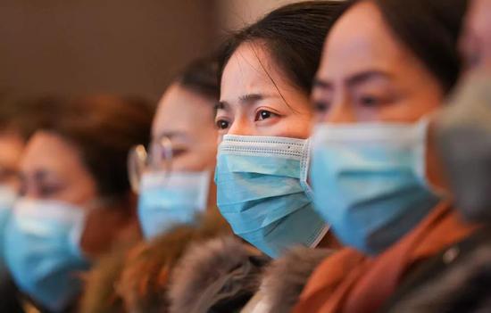 2020年1月25日,上海医疗队医护人员在培训会上。当日凌晨,上海医疗队共计136名医护人员抵达武汉。并立刻在武汉市金银潭医院附近开始培训,培训后将参与疫情防治工作。据了解,这些医护人员来自上海华山医院、瑞金医院、新华医院、胸科医院、仁济医院等各大医院。