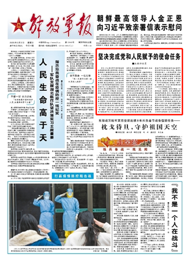 近日,习主席对军队做好新型冠状病毒感染的肺炎疫情防控工作作出重要指示,强调要牢记宗旨,勇挑重担,为打赢疫情防控阻击战作出贡献。中央军委专门印发《通知》,对坚决贯彻习主席重要指示,加强军队党的领导、打赢疫情防控阻击战,作出明确部署,提出具体要求。各级党组织和广大党员要按照《通知》要求,自觉用党中央、习主席决策指示统一思想和行动,牢记疫情就是命令、防控就是责任,不负重托、不辱使命,坚决完成党和人民赋予军队的疫情防控任务。