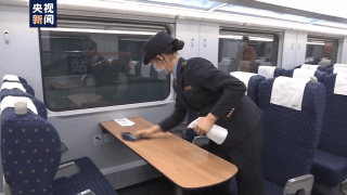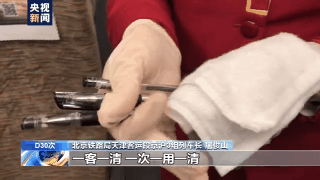 北京铁路局天津客运段京沪3组列车长 屠俊山:这个就是我们车上配备的消毒液,这是车上配备的消毒毛巾,我们用配备的消毒液对毛巾进行消毒喷施,然后进行消毒,然后对旅客使用的笔进行拭擦,一客一清,一次一用一清。只要旅客接触到的地方列车都做好消毒工作。