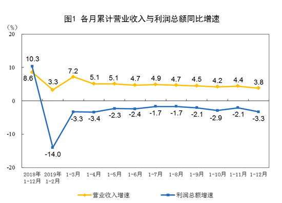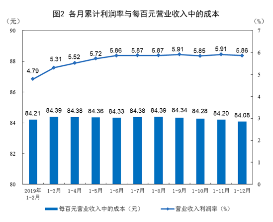 2019年12月份,规模以上工业企业实现利润总额5883.9亿元,同比下降6.3%,11月份为同比增长5.4%。