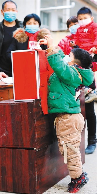 ▲山东省沂南县蒲汪镇陡沟村自发为湖北抗击疫情捐款现场,5岁的赵同贺踮起脚,捐出自己的压岁钱。 杜昱葆摄