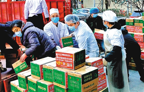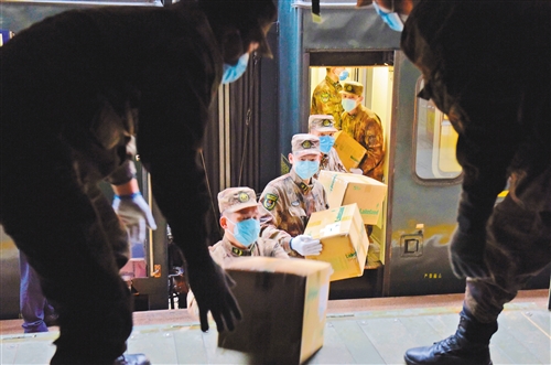 ▲在湖北武汉执行疫情防控任务的解放军官兵在汉口火车站抢运从辽宁沈阳、山东菏泽紧急调拨的物资。 范显海摄
