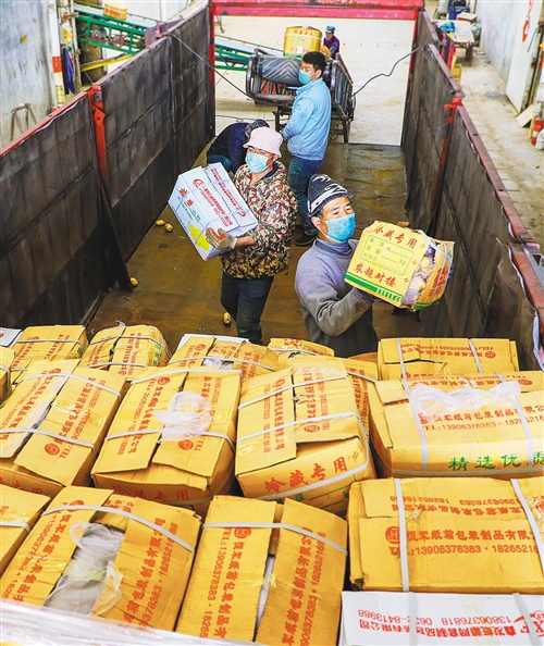 ▼由山东省滕州市捐助武汉的66吨马铃薯,正在滕州市大坞镇龙泉村仓库装车,援助武汉菜品供应。 宋海存摄
