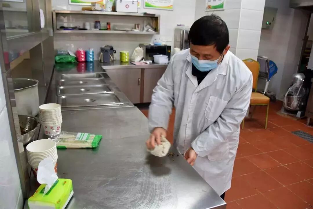 凌晨5点半,食堂里已出现忙碌的身影,设备车间陈仰光面戴口罩、身着白色工作服正在做卫生消毒,准备为大家做早餐。受疫情影响,家住外地的食堂工作人员们无法出行,他和另一名同事承担起重任,对食堂卫生进行把关,落实分餐制管理。