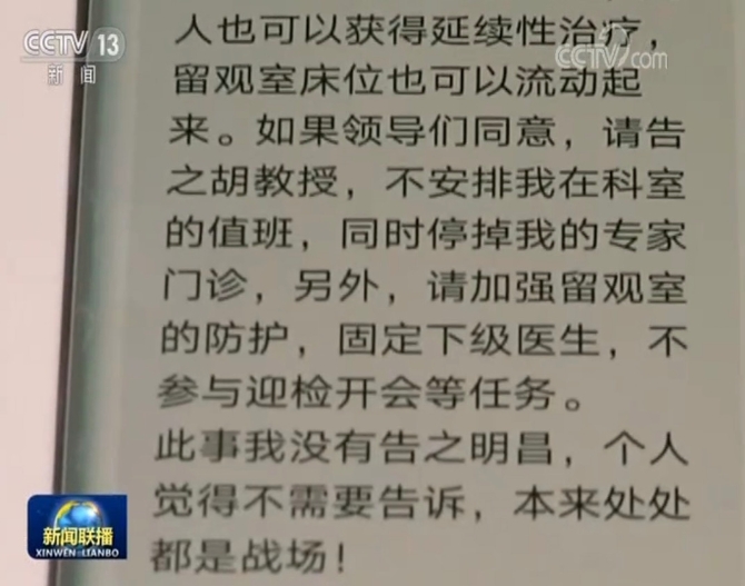 “此事我没有告知明昌。个人觉得不需要告诉,本来处处都是战场!”这是武汉大学人民医院呼吸与危重症医学II科党支部书记张旃的请战书,明昌是她的丈夫。作为一名曾经抗击过非典的呼吸科医生,她第一时间向医院请战。疫情发生以来,武汉大学人民医院7000多名员工全部放弃春节休假,全情投入到抗击疫情一线。随着1月30日,该院东院区改造为新型冠状病毒感染的肺炎患者集中收治点,他们的医疗救治任务更加繁重。而从1月18日至今,张旃始终在急诊留观室坚守。