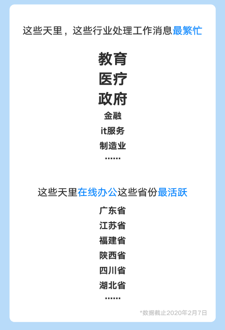疫情期间,白衣天使们一致奋战在一线,成为最辛苦的行业,教育、政府部门、金融、IT服务、制造业也通过远程办公为抗击疫情提供支持。此外,广东省、江苏省、福建省是线上办公最活跃的省份。
