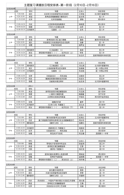 高三毕业班由昆明市教育体育局统筹组织实施,从今日开始,主要通过组织名师专家团队,录制专题教学课堂,利用昆广网络在昆明教育电视台播出,由学校组织学生在家同期收看学习。同时,可通过昆明教育电视台微信公众号信息平台反复学习。