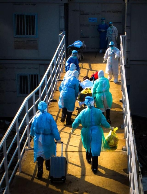 2月4日,在武汉火神山新型冠状病毒感染肺炎专科医院,医护人员将患者送入病房(无人机照片)。新华社记者肖艺九摄