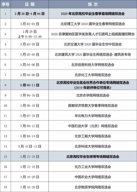 自2020年2月26日起,不同主题的网络双选会将陆续举办,每场双选会持续时间为3-7天。活动期间,毕业生可登录北京高校毕业生就业信息网 (www.bjbys.net.cn),通过注册审核后,即可在网络双选会期间进入各网上会场主页,参与求职,可查看各场次参会用人单位简介、招聘信息,在线投递简历。