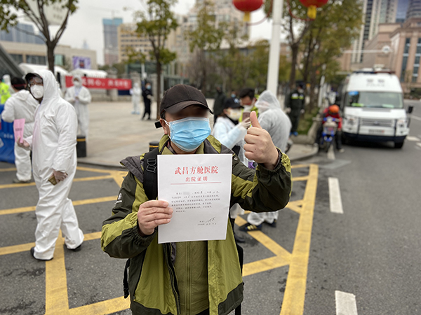 2月11日,在方舱治疗5天后,许峰等来了期待已久的好消息:胸部CT检测合格,两次核酸检测阴性。经湘雅二医院和湖北省肿瘤医院专家团队评估后,许峰有幸成为了第一批从武昌方舱医院出舱的28名患者之一。