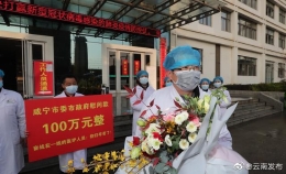 2020年2月17日早,云南援助湖北医疗队的护士俞克花在咸宁市第一人民医院十病区巡视病房时,发现一位73岁确诊新冠肺炎的老大爷情绪低落,眉宇间难掩忧色。来自曲靖市中医医院的俞克花便和队友一起为老大爷加油打气,被医疗队真挚和热情感动,老大爷一扫阴霾,和大家一起放声高歌起来!歌声回荡在封闭了的病区,但封闭不了爱和希望,让我们一起面对疫情,战胜疫情!(云南网 记者郭建丽)