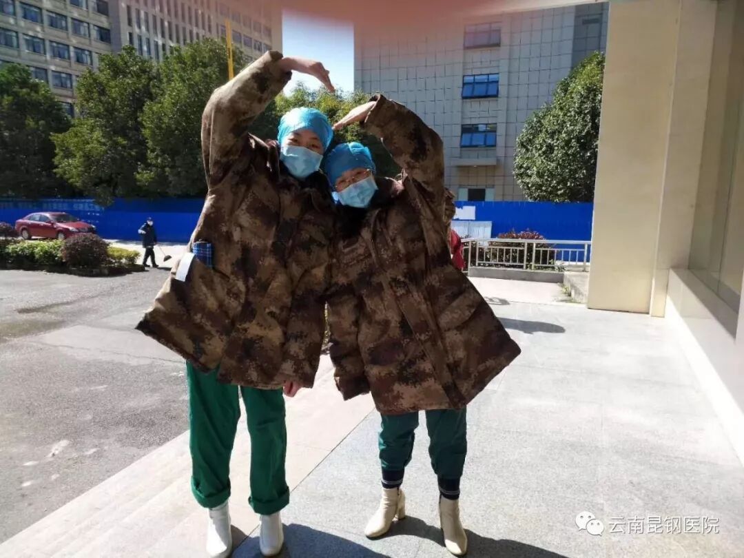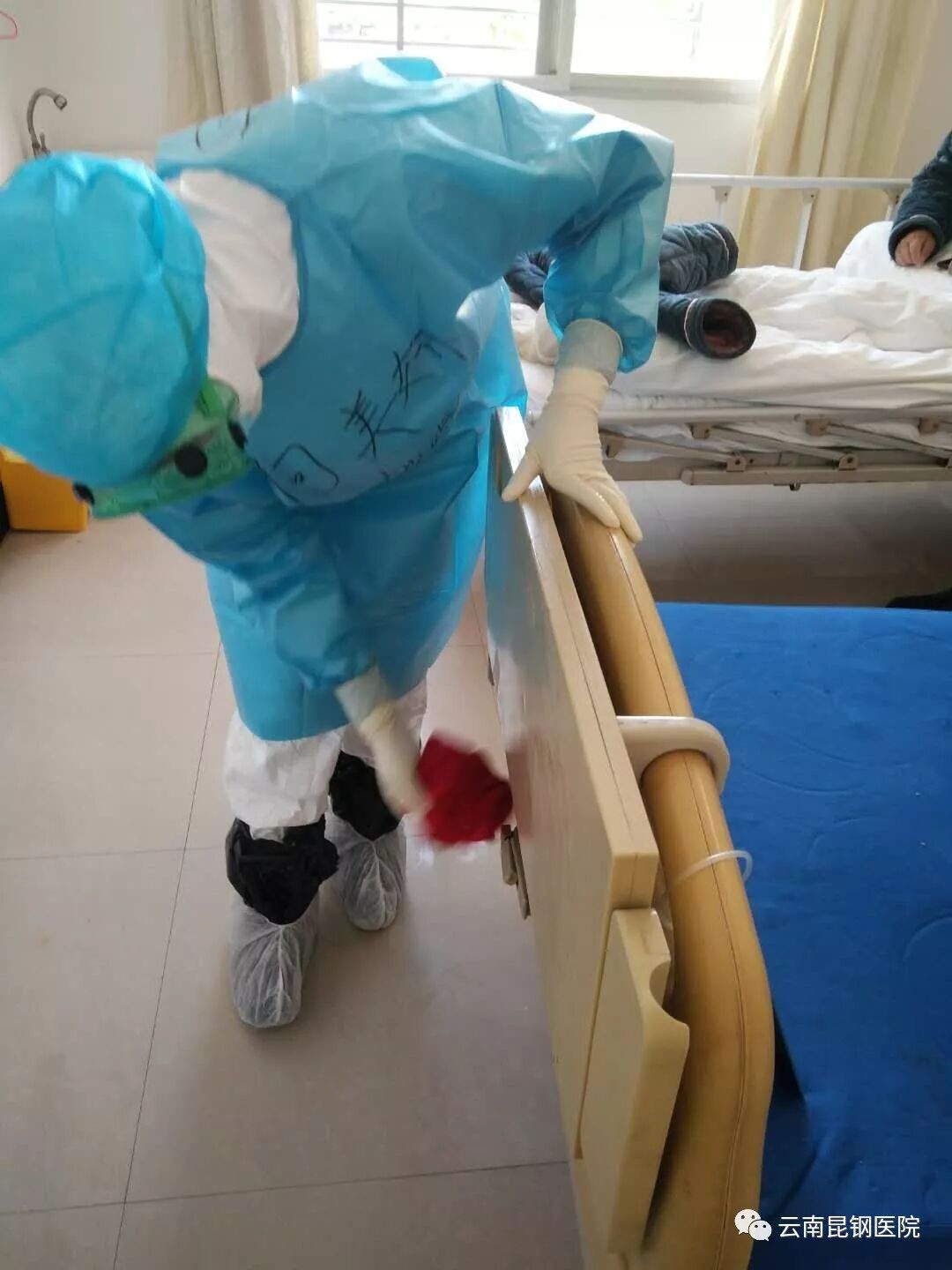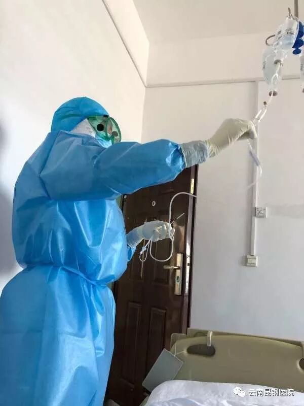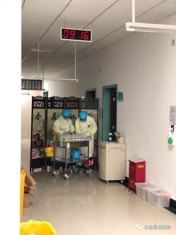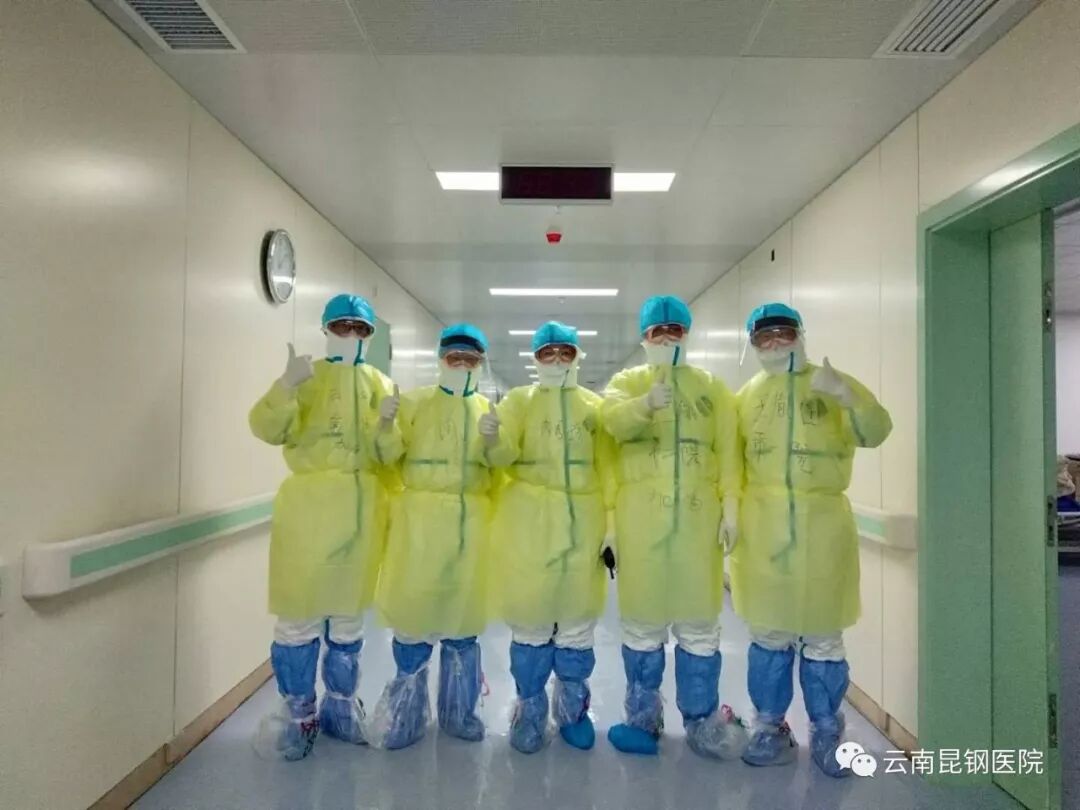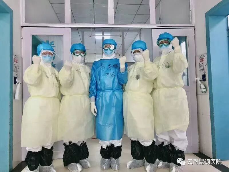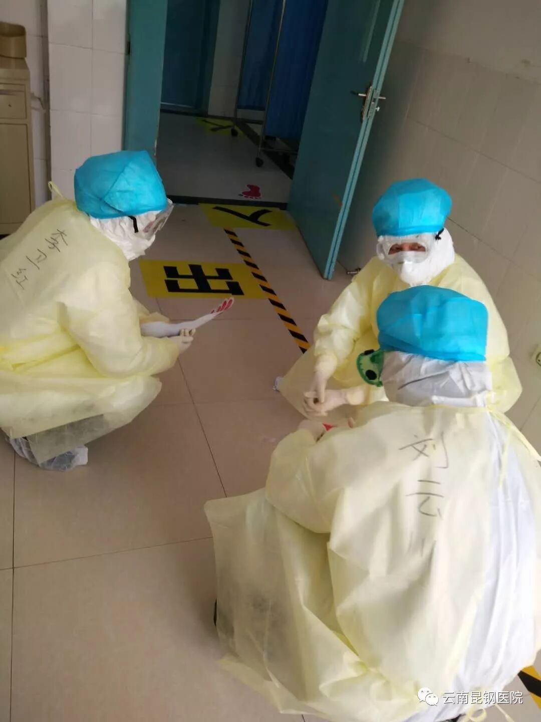 护士长让我们去病房看看的情况,我立刻报名,马上准备穿上装备到达前线,这时刚好兄弟医院延安医院、昆钢医院的老师也来到五区,你一句我一下的帮助我穿上防护服,最后一个老师抱着我说不要紧张,我们都在,我们现在是一家人,有我们呢,内心一股暖流油然而起。