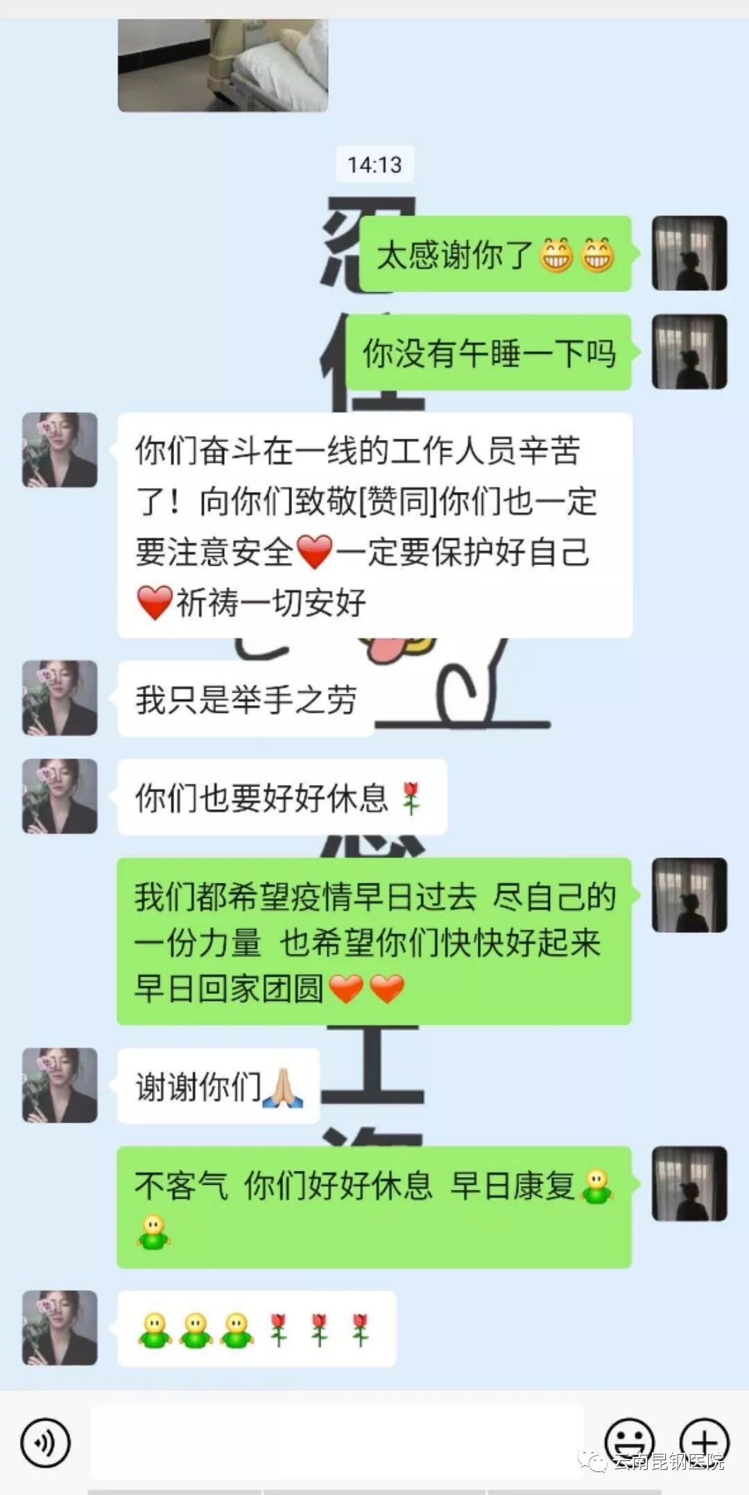 我今天上下午班(13:00—18:00),我进入病区时科室护士长热情迎接,口中问着冷吗?吃饭了吗?寒冷的天气,温暖的心。她们知道我们是从千里之外的云南来支援她们,很欢迎,带我们进入病区一一向病人介绍我们,口中都是谢谢。
