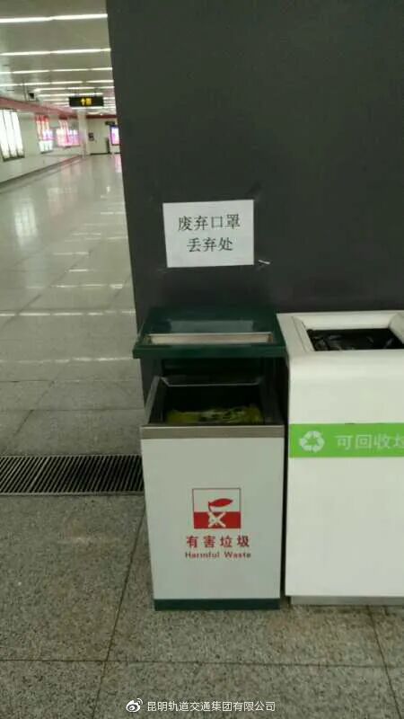 在全线57个地铁站均放置了废弃口罩专用垃圾箱,大家可将使用过的废弃口罩丢置于指定地点,有专人进行消毒后处理。